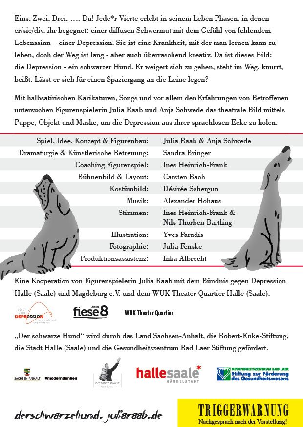 Mit Halbsatirische Karikaturen, Elementen der Choreographie, einer eigenen musikalischen Komposition und den Erfahrungen von Betroffenen untersuchen wir das theatrale Bild des schwarzen Hundes auf seine Tauglichkeit. Mit Maske, Puppe und Objekt holen wir die Depression aus ihrer sprachlosen Ecke.
